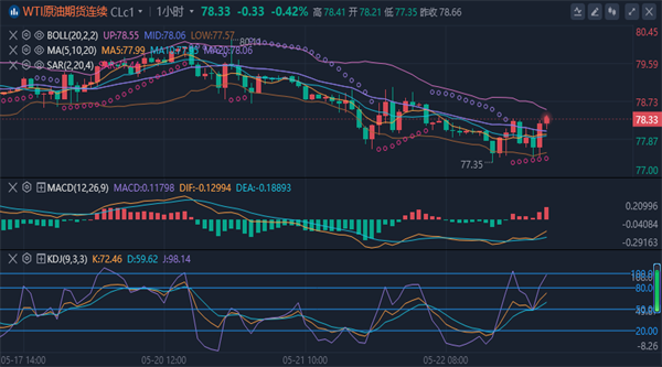 (原油2603,468.8,0.73%,模拟交易)周一冲高80关口后回落,周一持续下跌一度跌破78关口,目前油价运行在布林带中下轨之间,KDJ形成金叉,但是MACD死叉后向下运行于零轴下方,绿色能量柱有缩量的迹象,整体来看走势偏震荡。综合来看,今日原油短线操作思路上建议反弹做空为主,回调做多为辅,上方短期重点关注79.8-80.5一线阻力,下方短期重点关注77.0-76.5一线支撑。