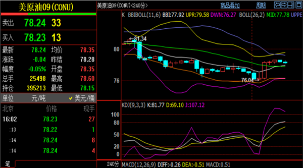 原油实时行情分析:周五原油美原油美原油04,63.30,0.67%模拟交易03,63.50,0.60%,模拟交易)早盘高点触及78.5,刚好把昨夜给的77.8空单止损设置78.4扫损离场,这很正常,我也不能做到百分百胜率,平常心对待,掌握主动才能更好的下次出手。技术面来看4小时布林带三轨平行发展,上轨阻力79关口,下轨支撑76.3一线,目前的价格交投于中轨77.5上方盘整,日内暂定77.5-79区间交投即可,后续破位再看行情延续。4小时附图指标上MACD快慢线金叉,红色量能柱放量,但KDJ随即指标接近超买区域,短周期参考指标产生冲突,大方向保持本周高点79.2承压看空即可。