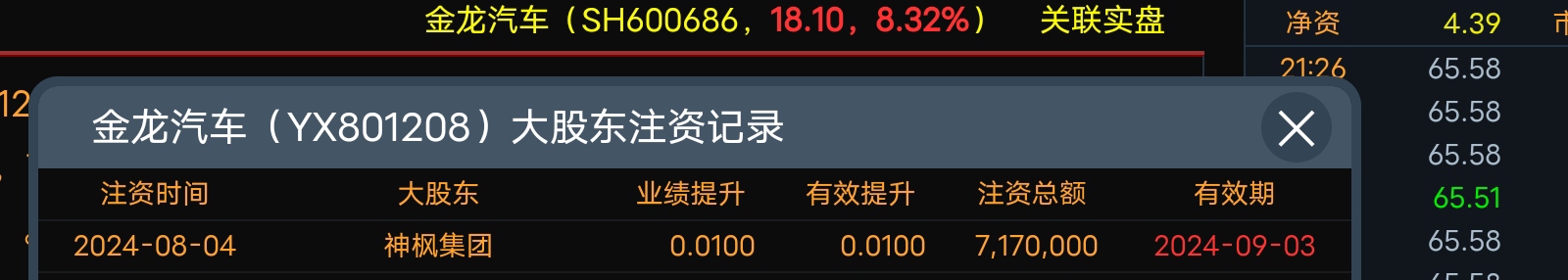 2024年8月4日,金龙汽车大股东神枫集团注资:717万元,业绩提升0.01元/股,有效期至2024年9月3日。