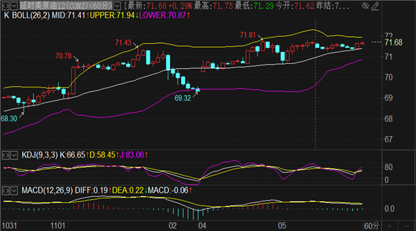(美原油(美原油04,63.30,0.67%,模拟交易)03,63.50,0.60%,模拟交易)周初的上涨并不算彻底反转,月线MACD量能还是出于下行放量状态,短期触顶还是参考月线MA5均线压力点72.1附近,向上预留几个点偏差即可,今日触及必须果断做空。技术面来看4小时布林带上轨阻力在72.2位置,而4小时SAR指标上移支撑点在71关口,4小时布林带中轨位于70.5,很明显的区间没有打开,短线交投尽量贴近高低点做反手建仓。