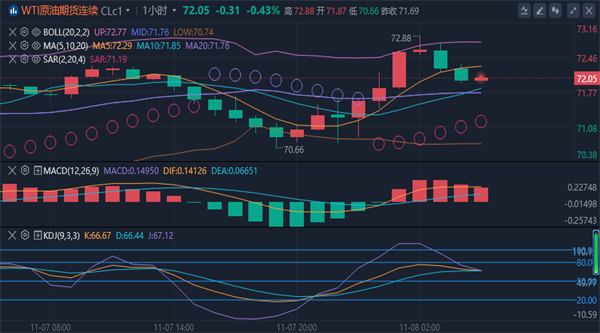 【原油技术面分析】:原油今日出现了先涨后跌走势,最高点触及72.25美元一带遇阻回落,油价逐步下跌,最低点触及70.656美元一带企稳徘徊。原油从日线图级别看,中期走势油价上下穿