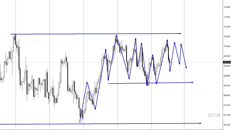 在一直来回震荡中,没有突破前高70.9,下方没有下破69.0,运行在一个窄幅区间中,没有形成趋势,目前油价止步于70.7一线,表明上方阻力位有效,下方支撑关注68.5一带,进一步下破后油价将再次回归下行趋势。综合以上分析,张亿富总结:油价震荡多次遇阻于70.7一带,表明了油价无力向上突破,考验下方支撑,今日操作上考虑高空低多策略,上方关注69.9-70.7美元阻力,下方关注68.5-67.5美元支撑。