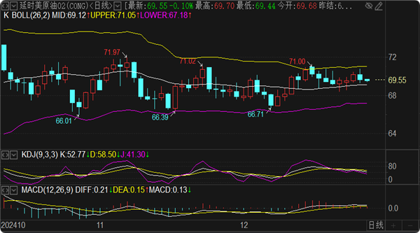 油价格再次回落至70关口下方运行。技术面来看,日线和4小时图形布林带三轨都处于平行发展,固化的震荡区间依然没有打开,