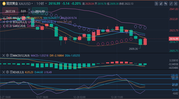 【黄金技术面分析】:周一金价在2620.00美元附近波动,日线图显示金价目前处于盘整阶段,接近9日和14日