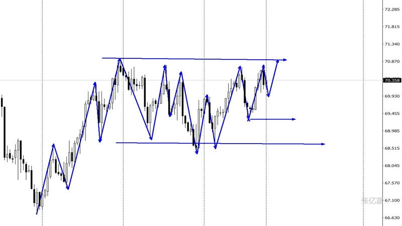 (美原油(美原油06,94.39,3.09%,模拟交易)05,98.34,3.19%,模拟交易)震荡向上突破,有望形成一个底部形态,后市操作上考虑回撤布局多单为先,高空为辅,上方关注72.6-73.4美元阻力,下方关注71.0-70.2美元支撑。周一原油实盘在70.4附近多,获利在71.2一带。