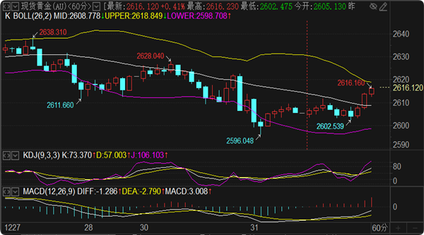 黄金实时行情分析:技术面上来看,1小时图形中实时价格突破至布林带中轨上方,却还是承压4小时布林带中轨下方,日内的反弹并不能当做反转对待,目前的震荡区间关注1小时下轨2598和4小时中轨2622区间震荡震荡,参考4小时SAR抛物线指标向下发散位于2724,昨日高点在2628附近,这就是今日的压力范围,只要没突破新高之前,延续主高空对待。