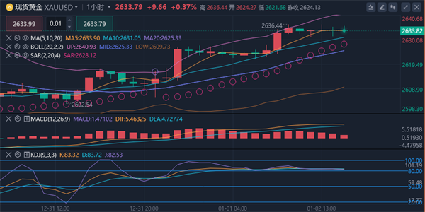 (美黄金04,4862.0,-2.98%,模拟交易)周四(1月2日)亚洲时段小幅上涨,目前交投于2634.10