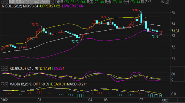 原油实时现报价73.3一线,昨夜触及74.9遇阻回落,周线长上影阴线控盘,亚盘原油价