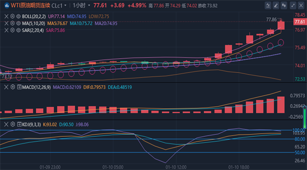 (美原油(美原油04,64.96,2.88%,模拟交易)03,65.39,2.98%,模拟交易)日内大涨4.00%,现报76.69美元/桶。布伦特原油现涨3.88%。布伦特原油