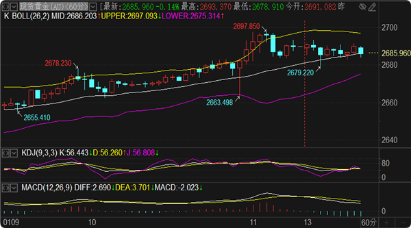今日阻力关注2697-2700范围压力点,若实体站稳2700,更上方参考周线SAR压制点2712和前高压制点2726两个节点。支撑方面留意1小时下轨2678位置,向下破位会延续走跌,短期参考2672和2665两个节点,若再次破位2665,更下方支撑直接看周线MA5