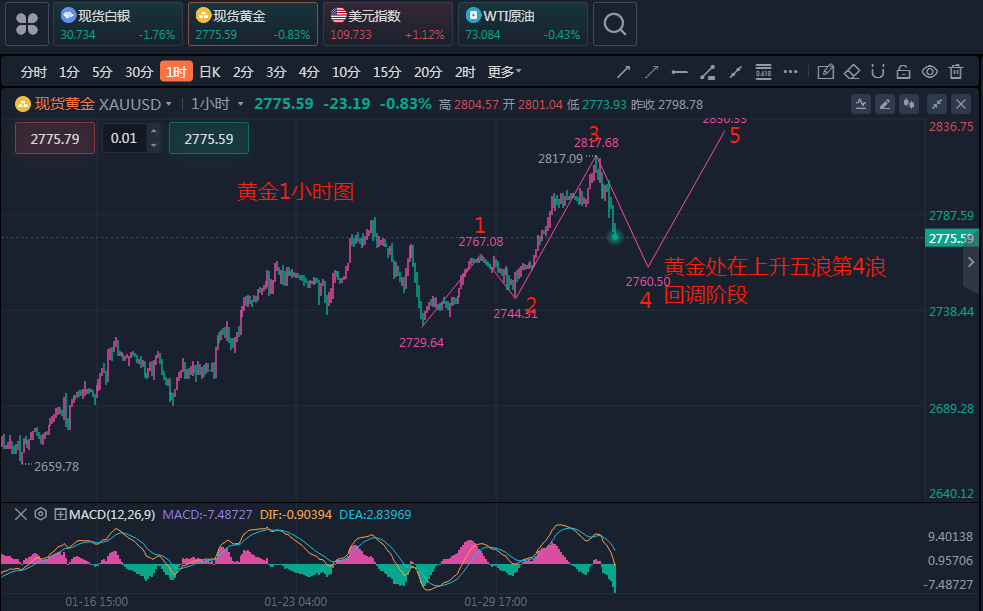 短线1小时图看金价走势亦可能产生大的反转,价格刚好在上升五浪第4浪的回调阶段,显示出当前行情整体走势偏弱。操作上建议反弹做空为主,回调低多为辅。