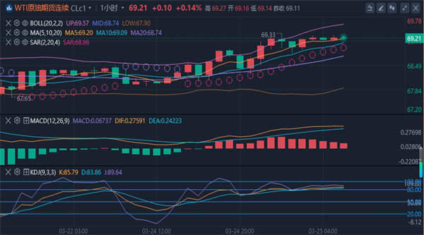 (美原油(美原油06,89.13,-2.65%,模拟交易)05,92.44,-3.00%,模拟交易)短线(1H)走势在区间上沿受阻回落,最终反弹回暖,并未突破创新高点。多空动能互相焦灼,短线客观趋势方向不明朗,主观方向向上,预计日内原油有望突破区间上沿阻力继续向上,空间有限。 综合来看,原油今日操作思路上以回踩低多为主,反弹高空为辅,上方短期关注70.2-70.7一线阻力,下方短期关注68.3-67.8一线支撑。