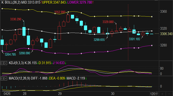 阻力方面关注先看1小时布林带中轨3315和1小时布林带上轨3325,向上突破看4小时布林带上轨和4小时SAR指标粘合压力点3340一线,更上方依次参考3362-3372和3386三个压力节点。整体来看黄
