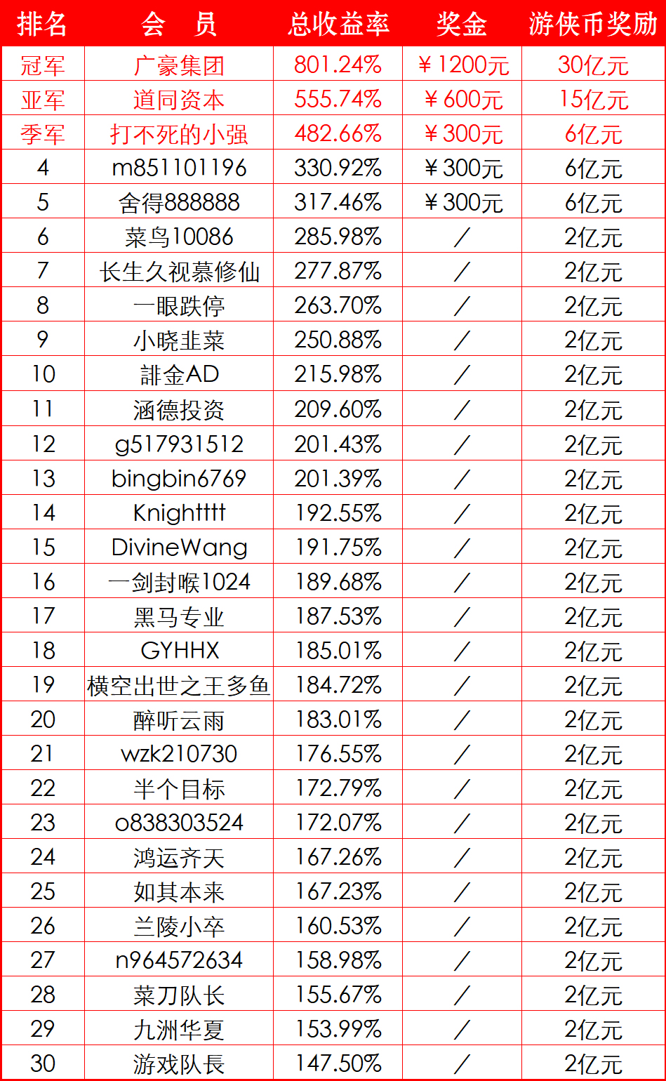 “游侠股市第二十四届模拟期货大赛”自2025年8月25日开始,至2025年10月18日结束,恭喜 @广豪集团 以801.24%的总收益率成为本届大赛的冠军,奖金¥1200元,并可获赠游侠币30亿元!恭喜 @涵德投资 以20.96亿元的总收益额获得本届大赛精英奖第一名,将获得虚拟钻石1200颗的奖励!本届大赛的获奖名单如下: