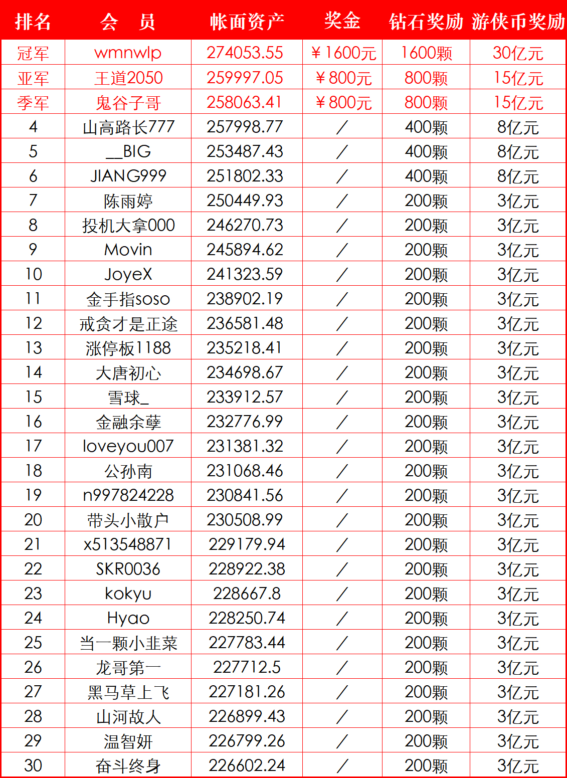 恭喜 @wmnwlp 以37.03%的总成绩成为本届大赛的冠军,奖金¥1600元,并可获赠虚拟钻石1600颗及游侠币30亿元!本届大赛的获奖名单如下: